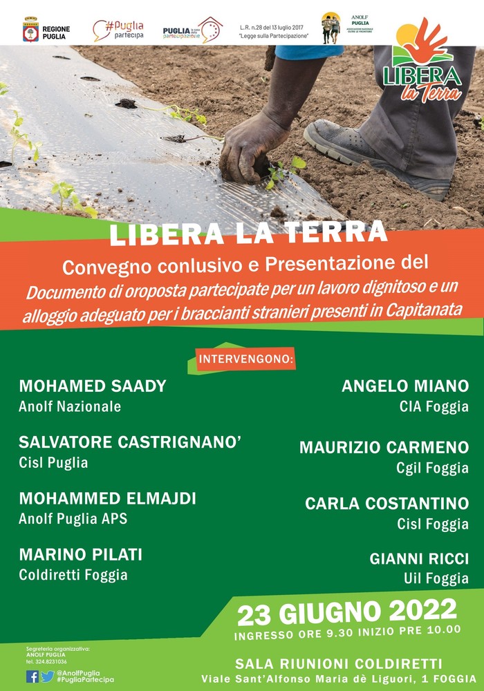 L’Anolf Puglia APS ha organizzato il Convegno del progetto “Libera la Terra” a Foggia presso la sala riunione della Coldiretti, giovedì 23 giugno 2022, dalle ore 10:00 alle 13:00.